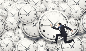 Concept of time with funny businessman running in a hurry