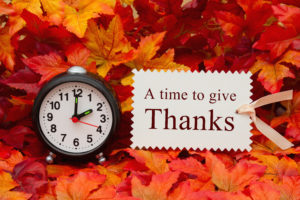 Time to give thanks message Some fall leaves and black and white alarm clock and beige gift tag with text A Time to give thanks