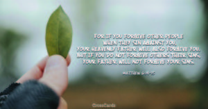 What does Jesus mean when he says that if we do not forgive others we will not be forgiven? I don’t think he is holding forgiveness back from us – I think he is trying to get us to understand that the grace that makes forgiveness available to us has to be accepted. How can we accept forgiveness for our own sins (against God and others) if we don’t believe we’ve done something wrong? And, if we know we’ve sinned, and have asked for and accepted the grace of forgiveness, how can we hold it back from others – but still expect our own slate to be wiped clean?