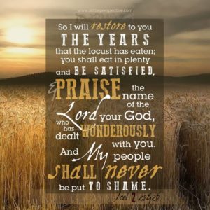 Joel 2:25-26 says this of God’s promise to us, “I will restore to you the years that the swarming locust has eaten, the hopper, the destroyer, and the cutter, my great army, which I sent among you. You shall eat in plenty and be satisfied, and praise the name of the Lord your God, who has dealt wondrously with you. And my people shall never again be put to shame.”