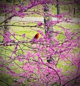 Springtime is my favorite season of the year. I yearn for the flowers to bloom, the trees to bud, the birds to sing, and the grass to green. The picture above was taken from my back porch over this past weekend. I sat and marveled at the redness of this cardinal sitting in the pinkness of the tree. Wow! God you are colorful and creative!