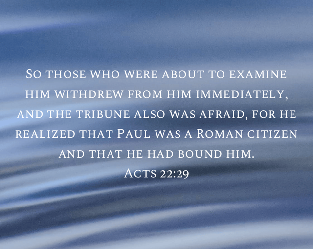 Paul’s citizenship ended up saving him from the beating. He paid nothing for it, yet it could have saved his life. This leads to thoughts of the cross where like the commander, the cross cost Jesus plenty (everything), yet salvation for us is a free gift if we choose to put our faith, hope, and trust in Christ alone.