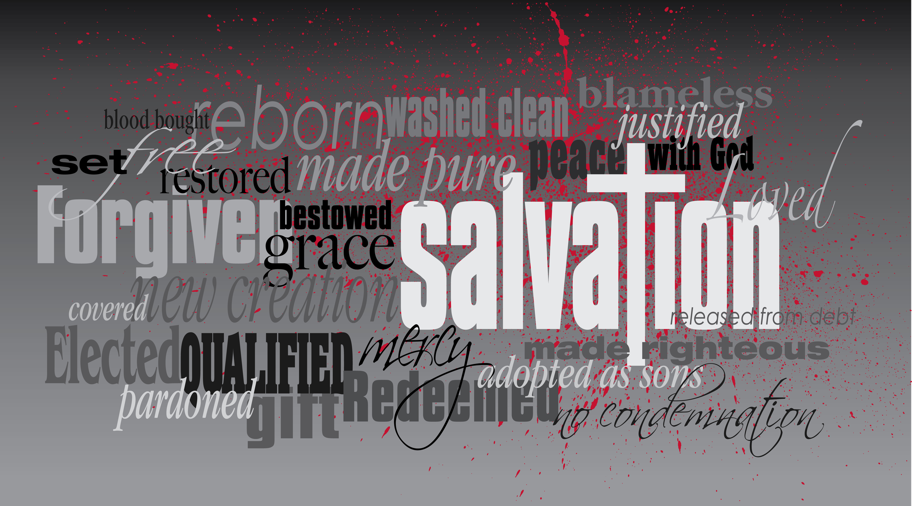 Graphic typographic illustration of the Christian concept of salvation. Art composed of mixed typefaces of associated words and concepts.